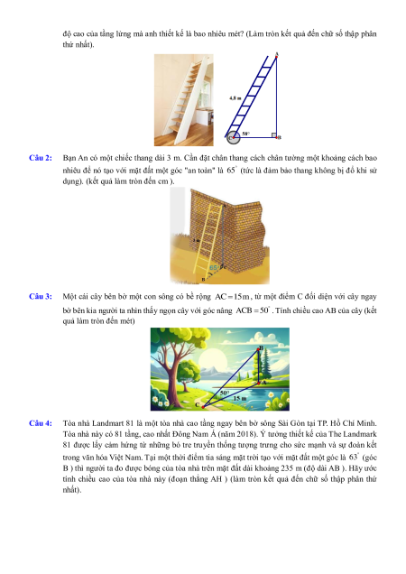 Câu 2: Bạn An có một chiếc thang dài 3 m. Cần đặt chân thang cách chân tường một khoảng cách bao
