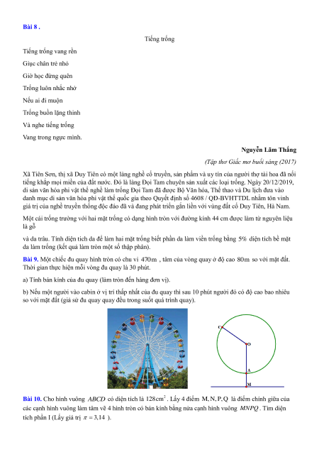 (kết quả làm tròn hai số thập phân). Bài 8 . Tiếng trống Tiếng trống vang rền Giục chân trẻ nhỏ Giờ học đừng quên Trống luôn nhắc nhở Nếu ai đi muộn Trống buồn lặng thinh Và nghe tiếng trống Vang trong ngực mình. Nguyễn Lãm Thắng