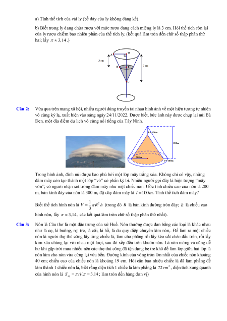Câu 1: Một cái ly thủy tinh (như hình vẽ), phần phía trên là hình nón có chiều cao 7 cm, có đáy đường