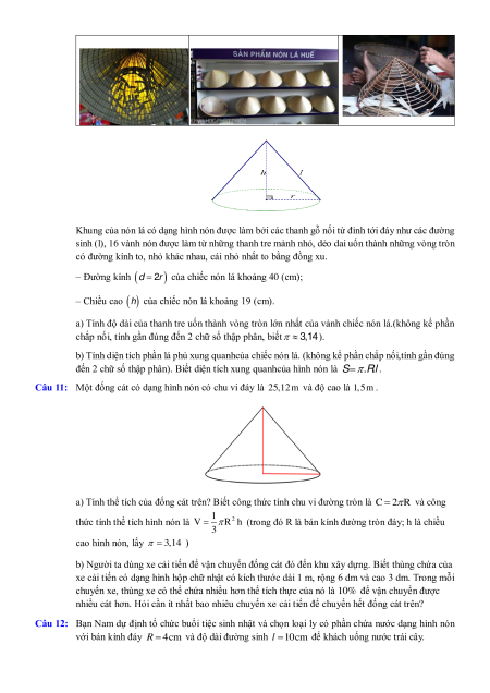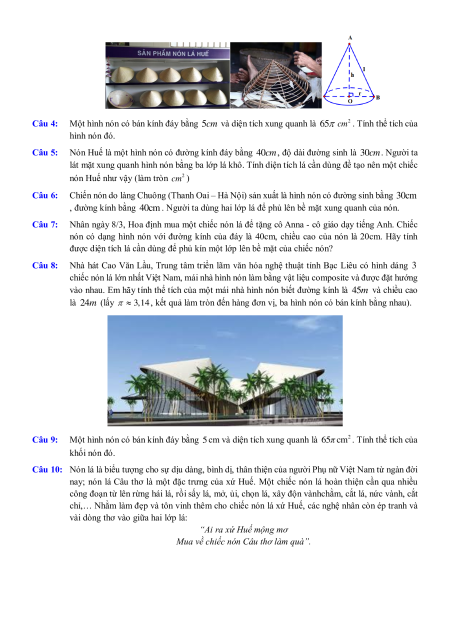 Câu 6: Chiến nón do làng Chuông (Thanh Oai – Hà Nội) sản xuất là hình nón có đường sinh bằng 30cm