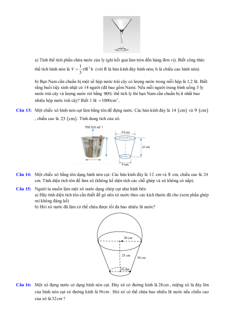 Câu 12: Bạn Nam dự định tổ chức buổi tiệc sinh nhật và chọn loại ly có phần chứa nước dạng hình nón