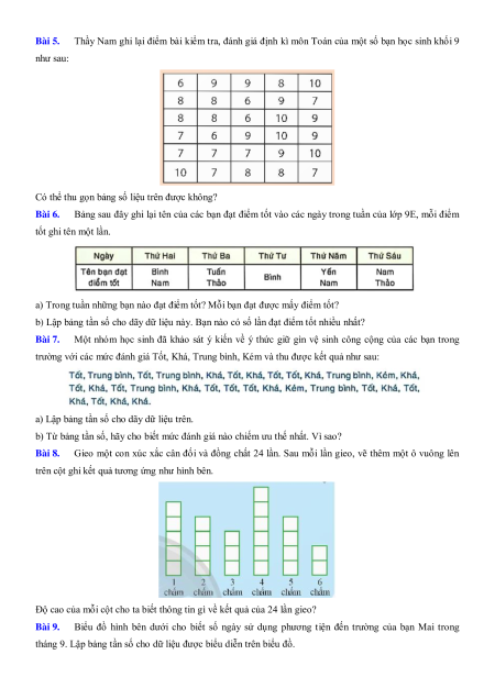 b) Lập bảng tần số cho dãy dữ liệu này. Bạn nào có số lần đạt điểm tốt nhiều nhất? Bài 7.