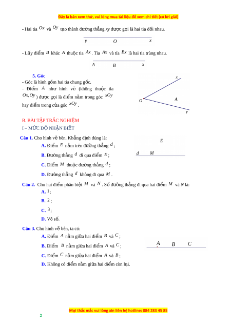 Câu 12. Cho 5 tia phân bi t ệ chung g c ố O , s góc ố tạo thành t 5 t ừ ia đó là: A. 5 ; B. 10 ; C. 4 ; D. 8 .