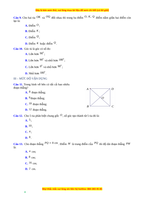 Câu 10. Góc tù là góc có s đo: ố A. L n h ớ n ơ 0 90 ; B. L n ớ h n ơ 0 90 và nh h ỏ n ơ 0 180 ; C. L n h ớ n ơ 0 0 và nh h ỏ n ơ 0 90 ; D. Nhỏ h n ơ 0 180 . III – M C Đ Ứ Ộ V N Ậ D N Ụ G