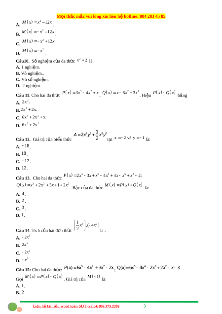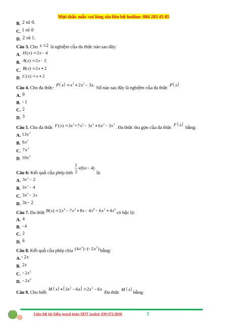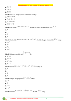 ệ otline: 084 283 45 85 B. 2 và 0. C. 1 và 0 D. 2 và 1. Câu 3. Cho x 2 là nghiệm c a ủ đa th c ứ nào sau đây: