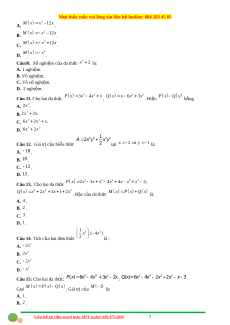 M x P x Q x . Bậc c a ủ đa th c ứ là: A. 4 . B. 2 . C. 3 . D. 1. 1 3 2 x .( 4x ) Câu 14. Tích c a ủ hai đ n t ơ h c ứ 2 là : A. 5 2x B. 5 2x C. 3 2x D. 5 x 5 4 2 5 4 3 2