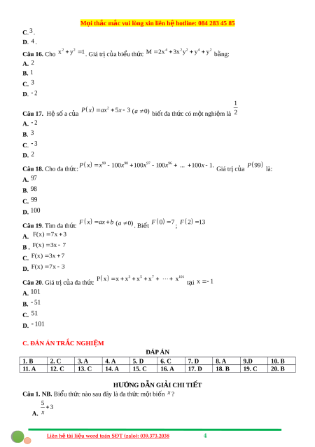 x x x x tại x 1 A. 101 B. 51 C. 51 D. 101 C. ĐÁN ÁN TR C Ắ NGHI M Ệ ĐÁP ÁN 1. B 2. C 3. A 4. A 5. D 6. C 7. D 8. A 9.D 10. B 11. A 12. C 13. C 14. A 15. C 16. A 17. D 18. B 19. C 20. B HƯ N Ớ G D N Ẫ GI I Ả CHI TI T Ế Câu 1. NB. Biểu th c