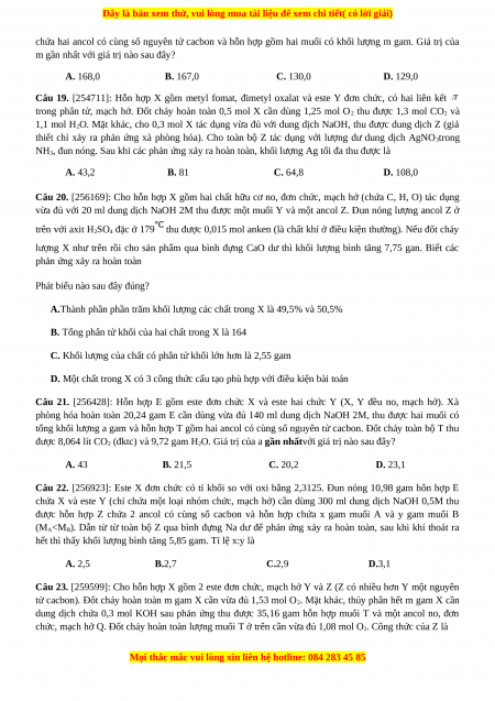 Câu 20. [256169]: Cho hỗn hợp X gồm hai chất hữu cơ no, đơn chức, mạch hở (chứa C, H, O) tác dụng