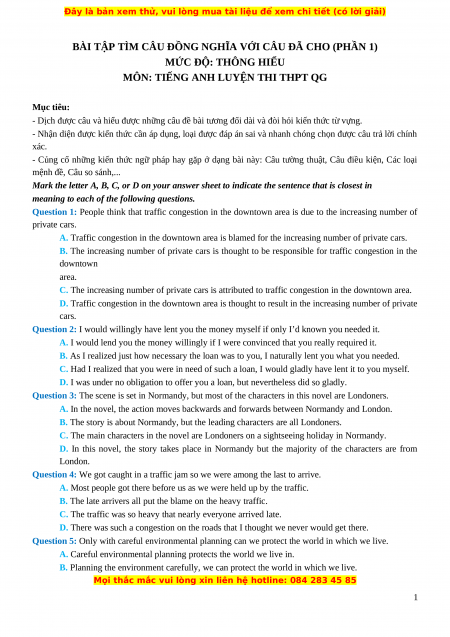 BÀI TẬP TÌM CÂU ĐỒNG NGHĨA VỚI CÂU ĐÃ CHO (PHẦN 1)