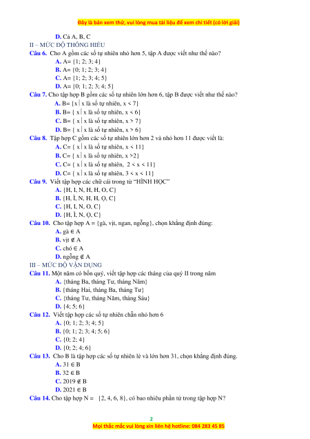 Câu 6. Cho A gồm các số tự nhiên nhỏ hơn 5, tập A được viết như thế nào? A. A= {1; 2; 3; 4} B. A= {0; 1; 2; 3; 4} C. A= {1; 2; 3; 4; 5}
