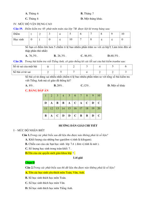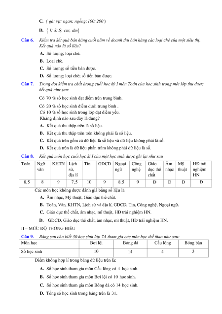 D. Kết quả trên là dữ liệu phần trăm không phải dữ liệu là số. Câu 8.