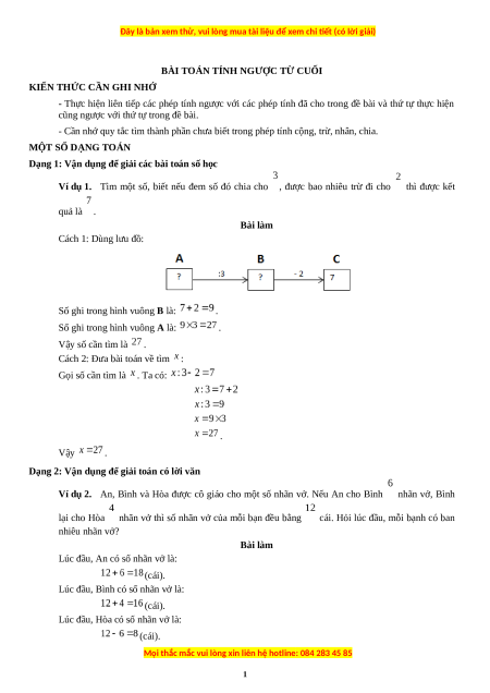 - Thực hiện liên tiếp các phép tính ngược với các phép tính đã cho trong đề bài và thứ tự thực hiện