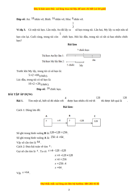 Lúc đầu, trong túi có số kẹo là: (chiếc). Đáp số: chiếc kẹo. BÀI TẬP ÁP DỤNG Bài 1.