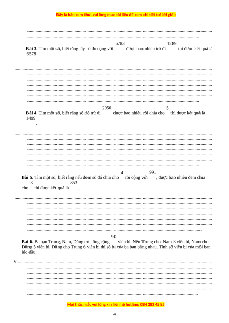 Bài 4. Tìm một số, biết rằng số đó trừ đi được bao nhiêu rồi chia cho thì được kết quả là