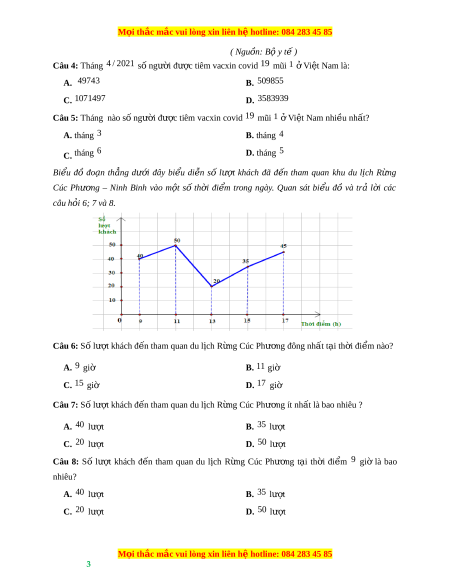 ơ đông nhất tại thời điểm nào? A. 9 giờ B. 11 giờ C. 15 giờ D. 17 giờ Câu 7: Số lư t ợ khách đ n t ế ham quan du l c ị h R ng ừ Cúc Phư ng ơ ít nhất là bao nhiêu ? A. 40 lư t ợ B. 35 lư t ợ C. 20 lư t ợ D. 50 lư t ợ Câu 8: Số lư t ợ khách đ n ế tham quan du l c ị h R ng ừ Cúc Phư ng ơ tại th i ờ đi m ể 9 giờ là bao nhiêu? A. 40 lư t ợ B. 35 lư t ợ C. 20 lư t ợ D. 50 lư t ợ M i