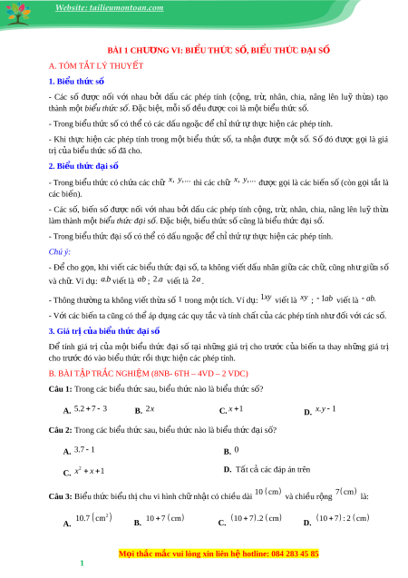 BÀI 1 CHƯƠNG VI: BI U Ể TH C Ứ S , BI Ố U Ể TH C Ứ Đ I Ạ SỐ A. TÓM T T Ắ LÝ THUY T Ế 1. Bi u ể th c ứ s ố - Các số đư c ợ n i ố v i ớ nhau b i ở d u ấ các phép tính (c ng, ộ tr ,