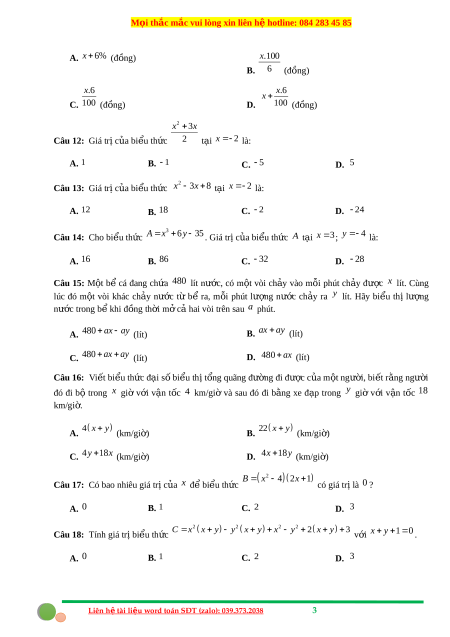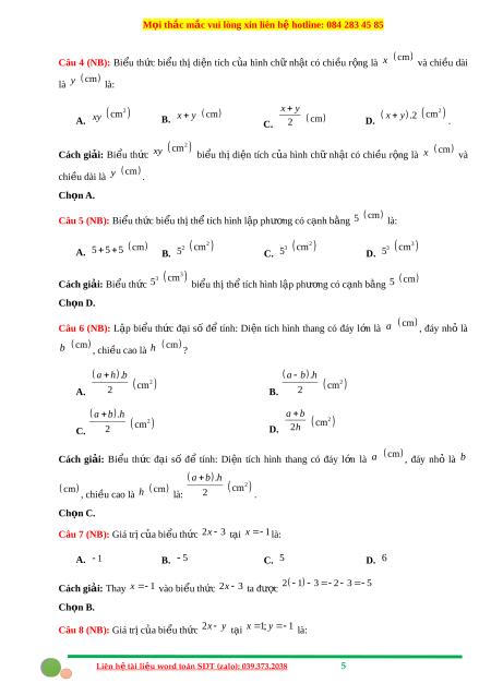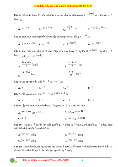 ệ otline: 084 283 45 85 cm Câu 4: Biểu th c ứ bi u ể thị di n ệ tích c a ủ hình chữ nh t ậ có chi u ề r ng ộ là x và chi u ề dài là y cm là: 2 x y cm x y cm x y 2 cm A. xy B. cm C. 2 D. .2 . cm Câu 5: Biểu th c ứ bi u t ể hị th t ể ích hình lập phư ng ơ có c nh b ạ ng ằ 5 là: cm 2 cm 2 cm 3 cm A. 5 5 5 2 3 3 B. 5 C. 5 D. 5 cm Câu 6: Lập bi u ể th c ứ đ i ạ số để tính: Di n