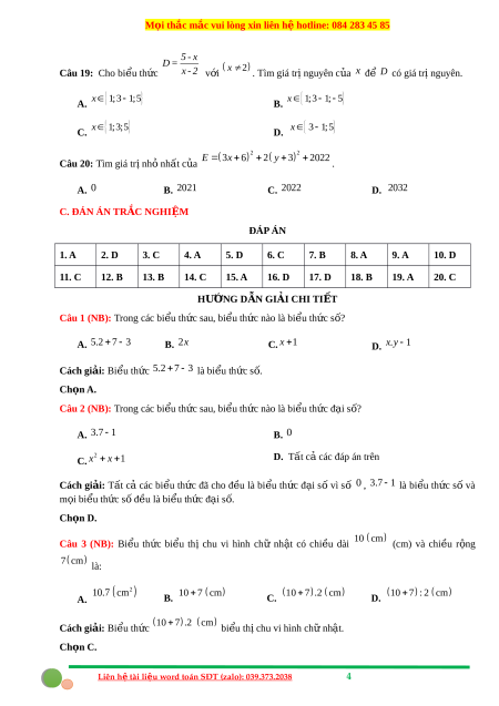 Câu 2 (NB): Trong các bi u th c sau, bi u th c nào là bi u th c đ i s ?ể ứ ể ứ ể ứ ạ ố