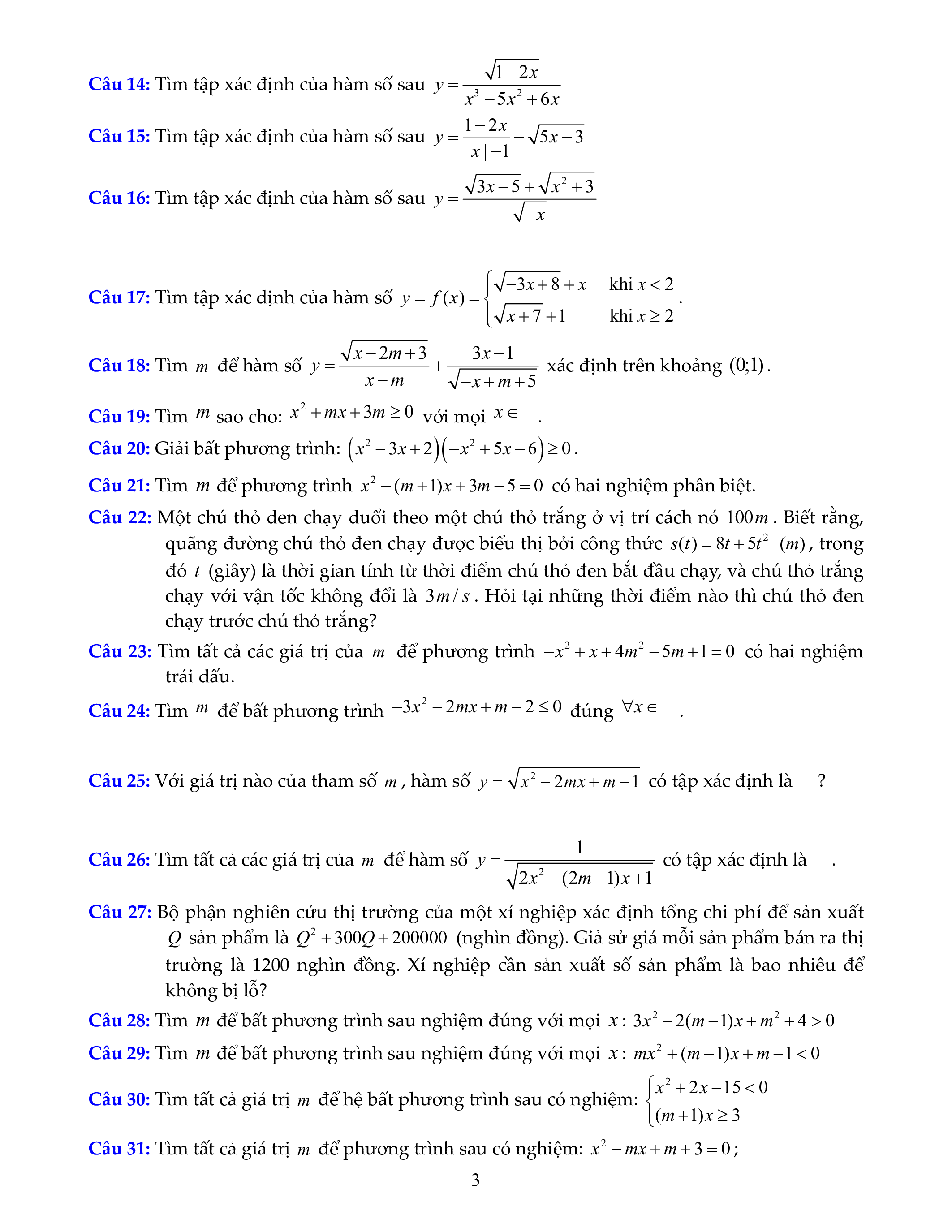 Câu 12: Tìm giá trị của tham số m để: Hàm số 2 1 x y x m xác định trên ( 1 ;3). x 2m