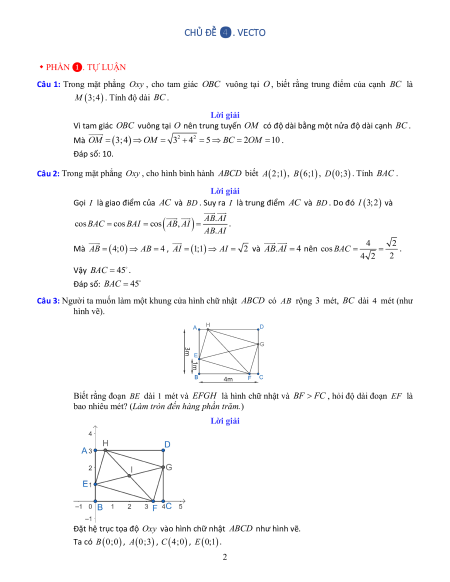 Câu 1: Trong mặt phẳng Oxy , cho tam giác OBC vuông tại O , biết rằng trung điểm của cạnh BC là