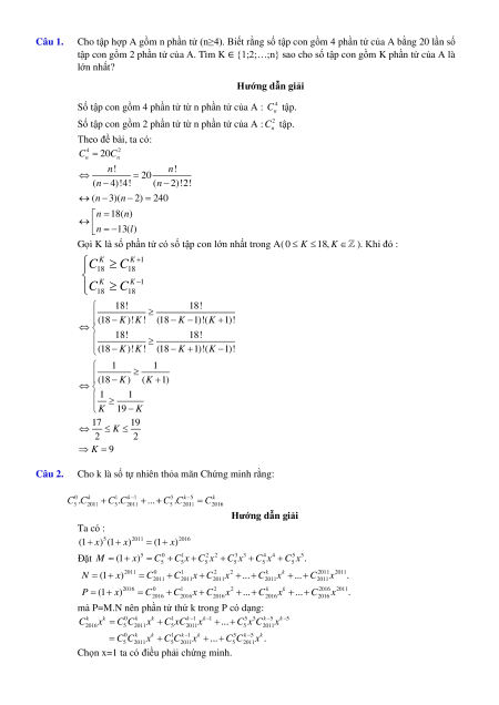 Gọi K là số phần tử có số tập con lớn nhất trong A( 0 K 18, K ). Khi đó : K K 1 + C C 18 18 K K 1 − C C 18 18 18! 18!