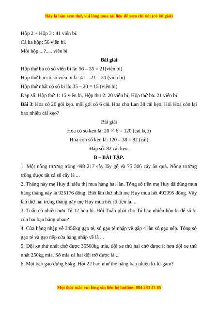 Hoa còn số kẹo là: 120 – 38 = 82 (cái) Đáp số: 82 cái kẹo. B – BÀI TẬP.