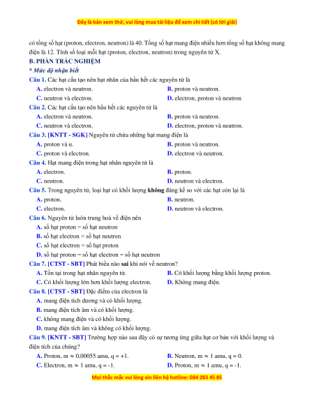 Câu 1. Các hạt cấu tạo nên hạt nhân của hầu hết các nguyên tử là