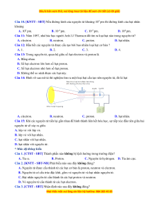 Câu 11: Năm 1897, nhà bác học người Anh J.J Thomson đã tìm ra loại hạt nào trong nguyên tử? A. electron. B. neutron. C. proton. D. hạt nhân.