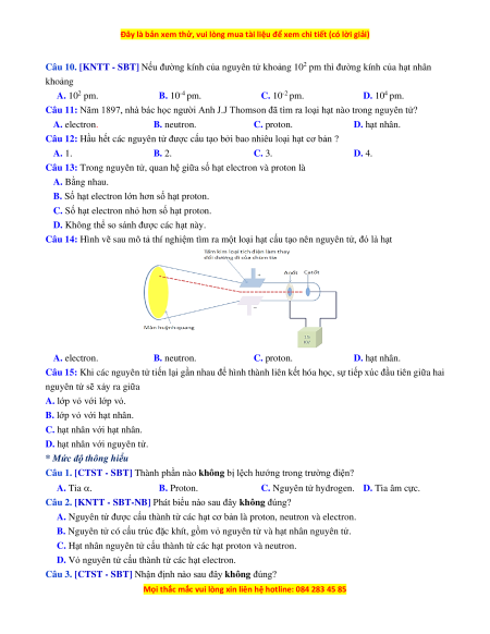 Câu 10. [KNTT - SBT] Nếu đường kính của nguyên tử khoảng 102 pm thì đường kính của hạt nhân khoảng A. 102 pm. B. 10-4 pm. C. 10-2 pm. D. 104 pm.