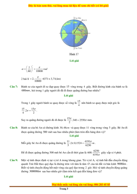 Lời giải 1 = = rad 60 10800 2 hải lí = 2. 6371 3,71( ) km 10800 Câu 7: