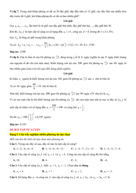Ví dụ 7. Trong một khán phòng có tất cả 30 dãy ghế, dãy đầu tiên có 15 ghế, các dãy liền sau nhiều hơn