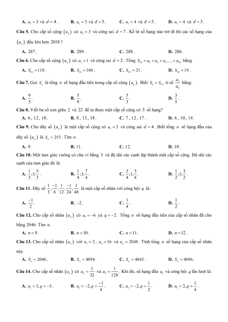 Câu 3. Cho cấp số cộng u , biết: u 3, u 1. Chọn đáp án đúng. n 1 2 A. u 4 . B. u 7 . C. u 2 . D. u 5. 3 3 3 3