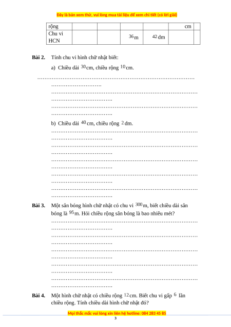 Bài 2. Tính chu vi hình chữ nhật biết: