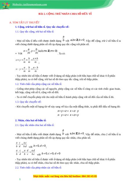 Website: tailieumontoan.com BÀI 2. C N Ộ G TR N Ừ HÂN CHIA S H Ố U Ữ TỈ A. TÓM T T Ắ LÝ THUY T Ế 1. C n ộ g, tr h ừ ai s h ố u ữ t . Q ỉ uy t c ắ chuy n ể vế: 1.1. Quy tắc c ng, ộ tr ha ừ i s h ố u t ữ ỉ: a - M i ọ số h u ữ tỉ đ u ề vi t ế đư c ợ dư i ớ d ng ạ b v i ớ , a b ; Z b 0 . Vậy để c ng ộ , trừ 2 số h u ữ tỉ ta viết chúng dư i ớ dạng phân s r ố i ồ áp d ng quy t ụ c ắ c ng ộ tr phâ ừ n s . ố a b x , y ( , a , b m ; Z m 0) + V i ớ m m . Ta có: a b a b x y m m m ; a b a b x y m m m - Tuy nhiên khi s h ố u t ữ đ ỉ ư c ợ vi t ế ở dạng s t ố hập phân (v i ớ h u h ữ n c ạ h s ữ ố khác 0 ph ở ần thập phân), ta có th c ể ng, ộ trừ hai s đó t ố heo quy tắc c ng, t ộ r s ừ t ố hập phân. 1.2. Tính chất c a ủ phép c ng c ộ ác s h ố u t ữ : ỉ - Gi ng ố như phép c ng