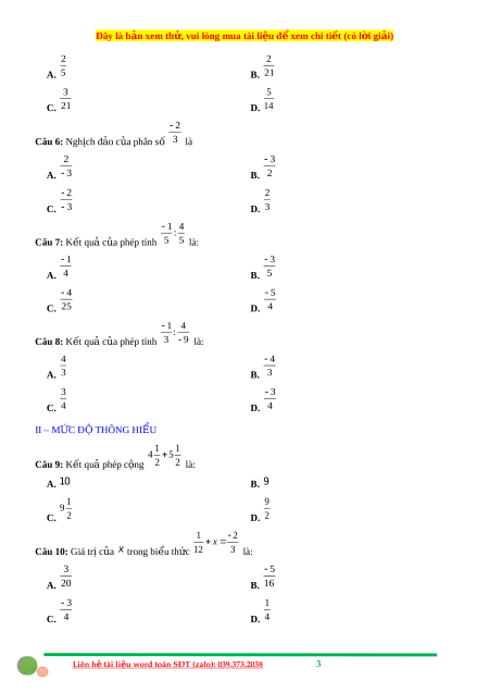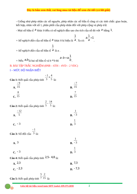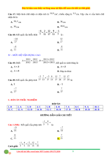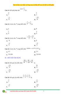 Ệ (8NB – 6TH – 4VD – 2 VDC) I – M C Đ Ứ N Ộ HẬN BI T Ế 1 4 Câu 1: Kết quả c a ủ phép tính 3 5 là: 9 7 A. 15 B. 15 8 7 C. 15 D. 15 2 14 Câu 2: Kết quả c a ủ phép tính 5 5 là: 12 1 A. 5 B. 3 1 C. 3 D. 3 1 Câu 3: S đ ố i ố c a ủ 3 là: 1 A. 3 B. 3 1 C. 3 D. 3 Câu 4: Kết quả c a