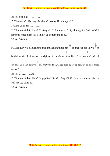 còn lại sau 3 lần bán và m, như vậy là vừa hết. Hỏi quầy đã bán tất cả bao nhiêu mét vải? Trả lời: …………....m