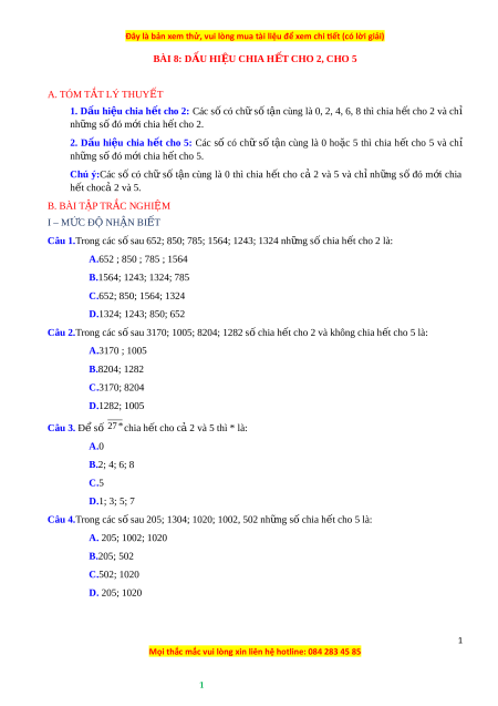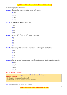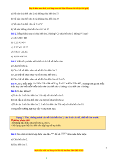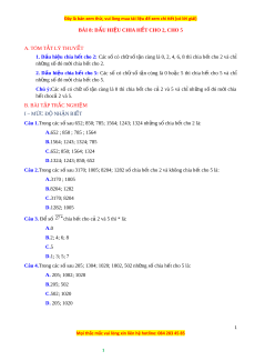 2 2 2 ... 2 . Khi đó A chia 5 d : ư A.0 B.1 C.2 D.3 Câu 19. S c ố ác s t ố nhi ự ên có 2 chữ s c ố hia h t ế cho 2 và không chia h t ế cho 5 là: A.45 B. 36 C.30 D.25 Câu 20.S c ố ác s t ố nhi ự ên không vư t ợ quá 100 th a ỏ mãn không chia h t ế cho 2 và chia 5 d 1 l ư à: A.10 số B.9 số C.8 số D.7 số C. CÁC D N Ạ G T LU Ự N Ậ D n ạ g 1. Nh n ậ bi t ế các s c ố hia h t c ế ho 2, cho 5 Phư n ơ g pháp gi i ả -S d ử ng ụ dấu hi u c ệ hia h t ế cho 2, cho 5. -S d ử ng ụ tính chất chia h t ế của m t ộ t ng ổ ( hi u), t ệ ích.