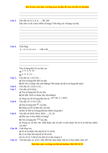 b) Số 195 có thuộc dãy trên không? Nếu thuộc thì đó là số hạng thứ mấy? Câu 6. Cho dãy số: 2;5;8;11;14;… Câu 7. Cho dãy số 0;3;6;9;…