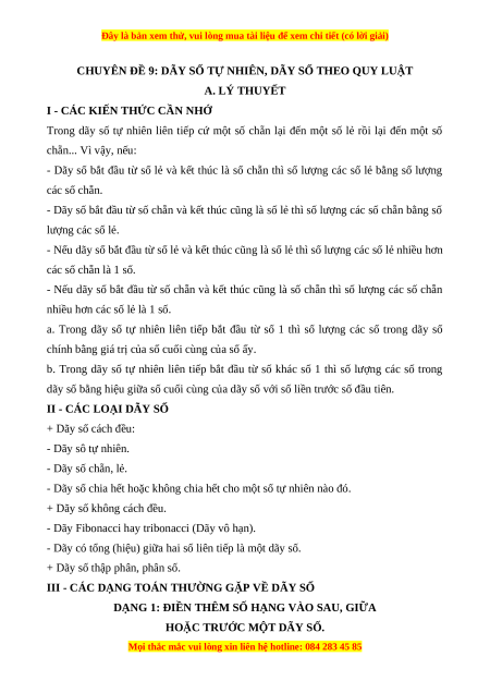 CHUYÊN ĐỀ 9: DÃY SỐ TỰ NHIÊN, DÃY SỐ THEO QUY LUẬT A. LÝ THUYẾT