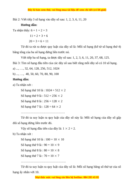 Bài 2: Viết tiếp 3 số hạng vào dãy số sau: 1, 2, 3, 6, 11, 20 Hướng dẫn: