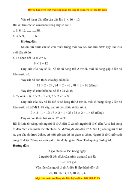 Bài 4: Tìm các số còn thiếu trong dãy số sau : a. 3, 6, 12, …, …, 96. b. 3, 5, 9, …, …, 65. Hướng dẫn: