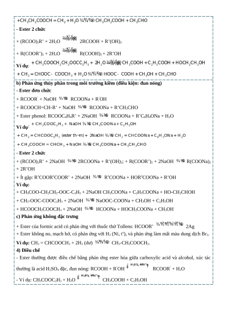 a) Phản ứng thủy phân trong môi trường acid (điều kiện: đun nóng) - Ester đơn chức + RCOOR’ + H2O RCOOH + R’OH + RCOOCH=CH-R’ + H2O RCOOH + R’CH2CHO