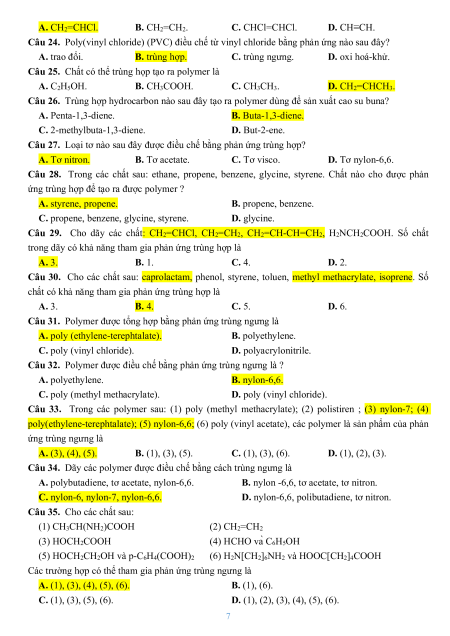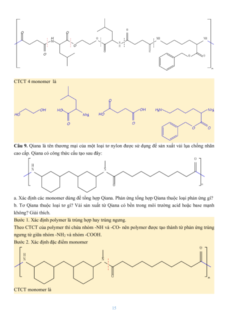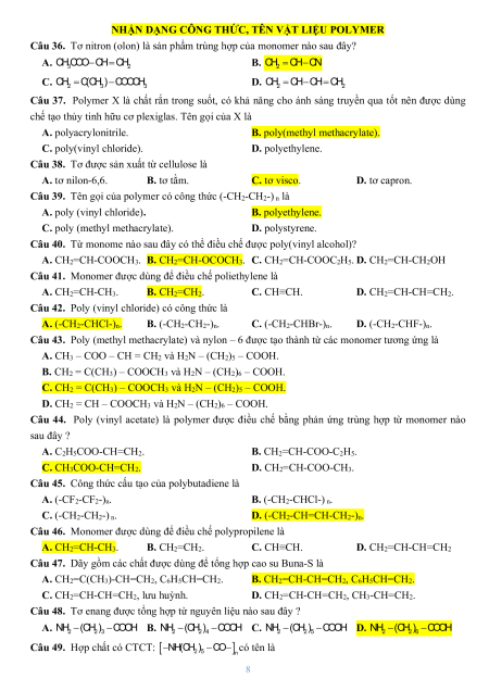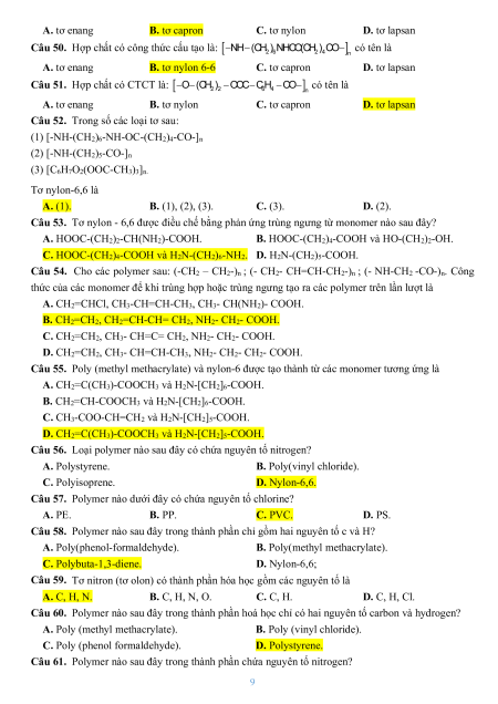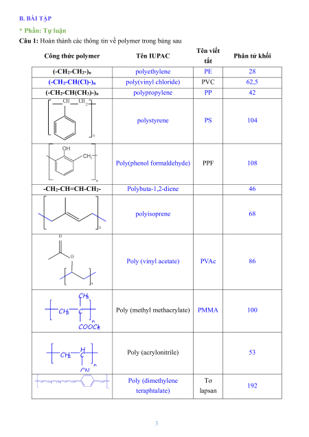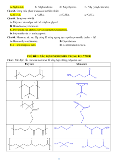 Có ít nhất hai nhóm chức có khả năng phản ứng (-OH, -NH2, -COOH). VD: HOOC–C ethylene polyethylene (PE) 6H4–COOH, HOCH2CH2OH, H2N[CH2]5COOH, H2N[CH2]6NH2, HOOC[CH2]4COOH, … Caprolactam tơ capron 2 B. BÀI TẬP * Phần: Tự luận