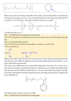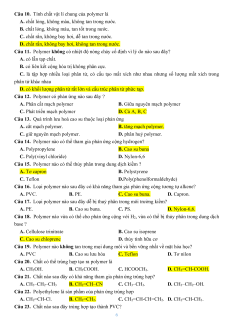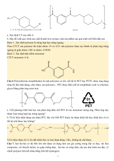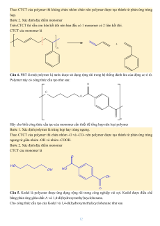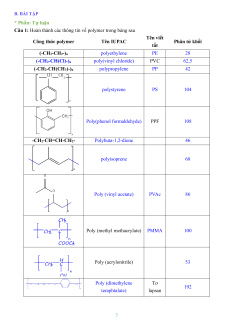 Câu 1: Hoàn thành các thông tin về polymer trong bảng sau Tên viết Công thức polymer Tên IUPAC Phân tử khối tắt (-CH2-CH2-)n polyethylene PE 28 (-CH2-CH(Cl)-)n poly(vinyl chloride) PVC 62,5 (-CH2-CH(CH3)-)n polypropylene PP 42 polystyrene PS 104 Poly(phenol formaldehyde) PPF 108 -CH2-CH=CH-CH2- Polybuta-1,2-diene 46 polyisoprene 68 Poly (vinyl acetate) PVAc 86
