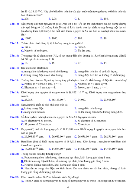 Câu 5: Nguyên tử oxygen–16 có 8 proton, 8 neutron và 8 electron. Tính khối lượng nguyên tử oxygen theo đơn vị gam và amu? Đáp án: 24 24 28 23 + m