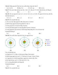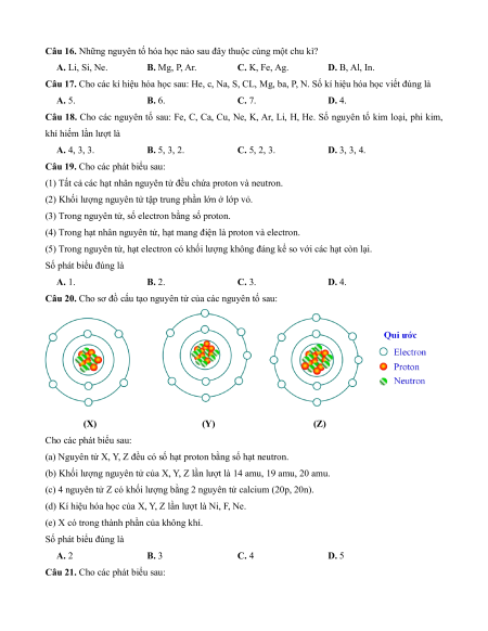 Câu 16. Những nguyên tố hóa học nào sau đây thuộc cùng một chu kì? A. Li, Si, Ne. B. Mg, P, Ar. C. K, Fe, Ag. D. B, Al, In.