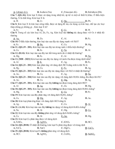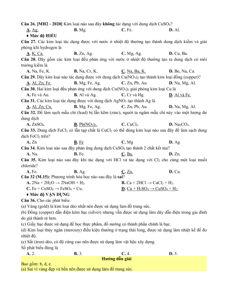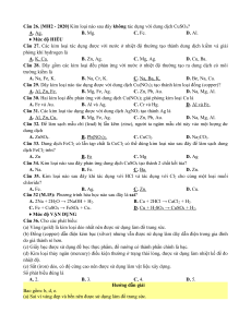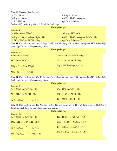 Câu 4. Cho các cặp chất sau: (a) Zn + HCl (b) Cu + ZnSO4 (c) Fe + CuSO4 (d) Cu + H2O (e) Cu + HCl (g) Ag + H2SO4 loãng (h) Fe + HCl (i) Ba + H2O (k) Mg + O2 (l) Zn + H2O (m) Ag + O2 (n) Fe + Cl2