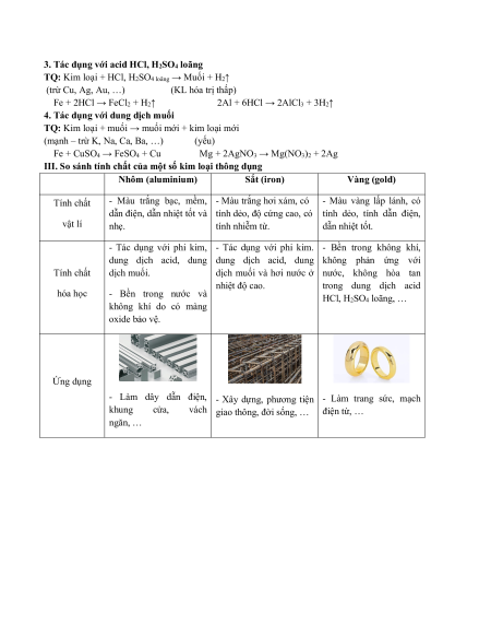 III. So sánh tính chất của một số kim loại thông dụng Nhôm (aluminium) Sắt (iron) Vàng (gold) Tính chất