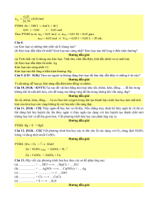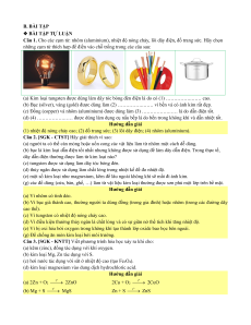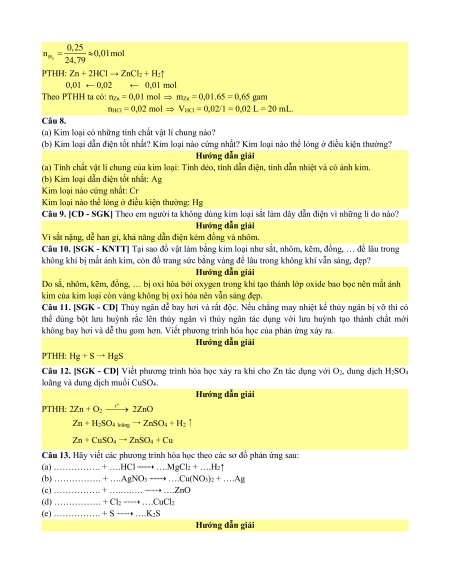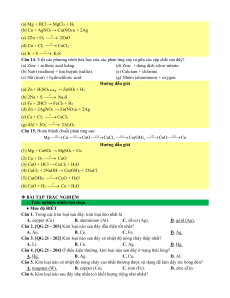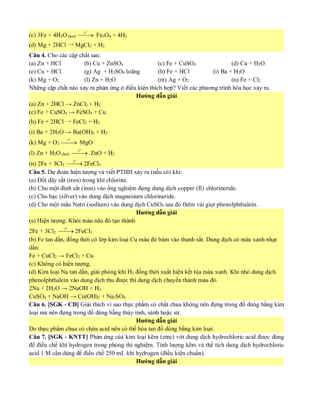 (d) kim loại magnesium vào dung dịch hydrochloric acid. Hướng dẫn giải (a) 2Zn + O o t o t 2 2ZnO 2Cu + O2 2CuO (b) Mg + S o t MgS Zn + S o t ZnS (c) 3Fe + 4H o t 2O (hơi) Fe3O4 + 4H2 (d) Mg + 2HCl → MgCl2 + H2