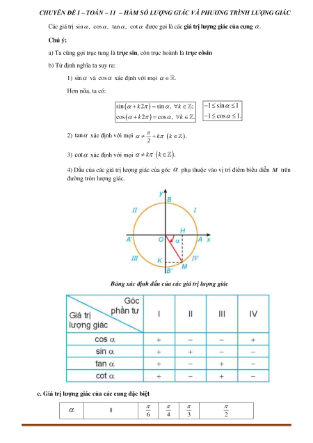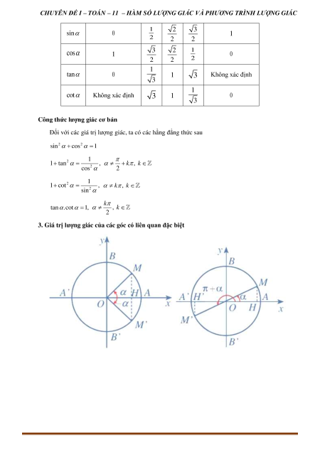 CHUYÊN ĐỀ I – TOÁN – 11 – HÀM SỐ LƯỢNG GIÁC VÀ PHƯƠNG TRÌNH LƯỢNG GIÁC 1 3 sin 0 2 1 2 2 2 cos 3 2 1 1 0 2 2 2 1 tan 0 1 3 Không xác định 3 1 cot Không xác định 3 1 0 3